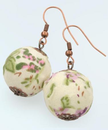 Textil anyaggal bevont gyöngy, fehér, virágmintás (világoszöld, lila és rózsaszín), gömb forma, 2 cm.