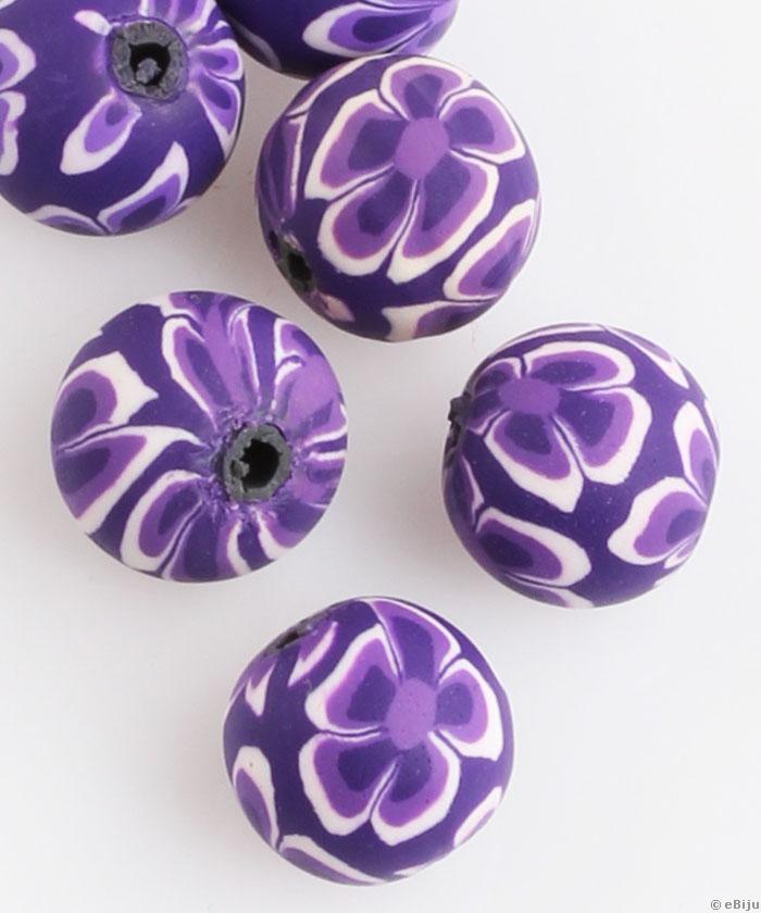 Virágmintás fimo gyöngy, lila, gömb forma, 1.2 cm