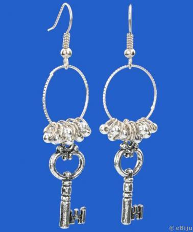 Barokk stílusú kulcs függő dísz, charm típusú, fémes felületű, antikolt ezüstszínű akril, 1.3 x 2.7 cm.