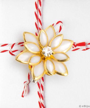 Virág függő dísz, hegyes szirmokkal, aranyszínű fém, fehér akril kristályokkal, 2.2 cm.
