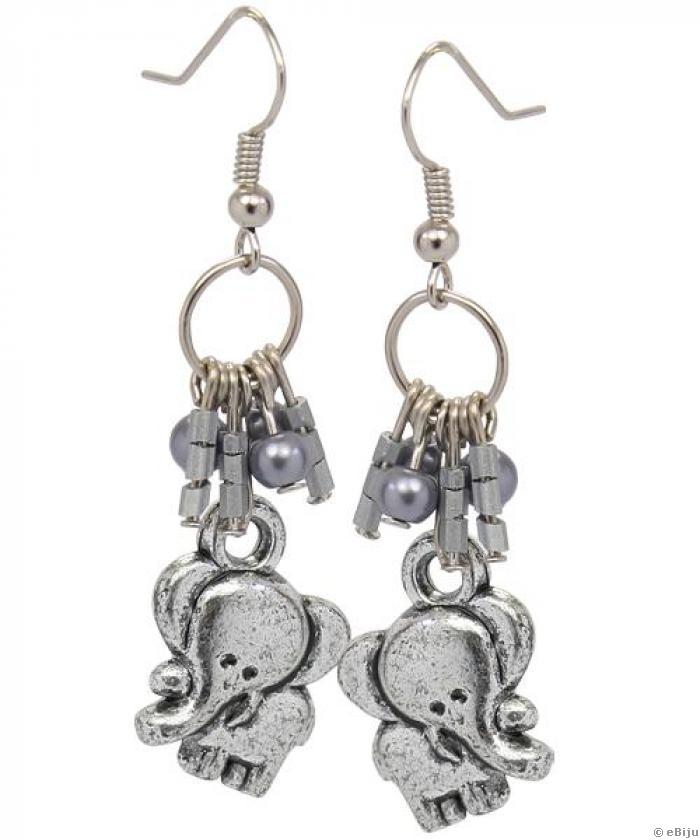 Ezüst színű, elefántos fülbevaló, szürke üveggyöngyökkel, hosszúság: 5.5 cm, súly: 3.8 g