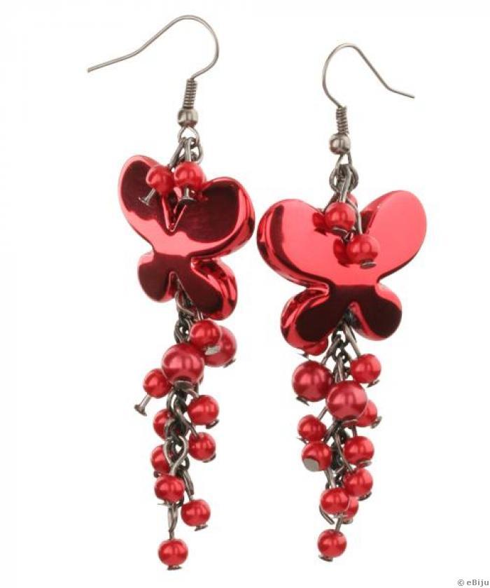 Piros pillangó fülbevaló üveggyöngyökkel. Pillangó átmérője: 3.3 cm, gyöngyök átmérője: 0.4 - 0.6 cm