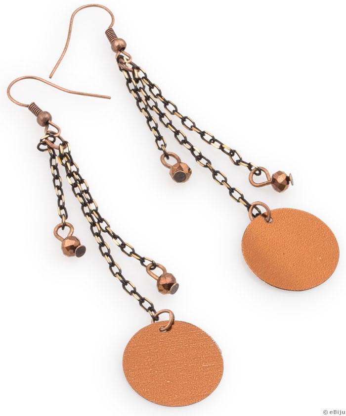 Hosszú, rézszínű fém érmés fülbevaló, három szál fekete-arany színű lánccal. A két rövidebbik lánc végén egy-egy fazettált barna kristály függ.