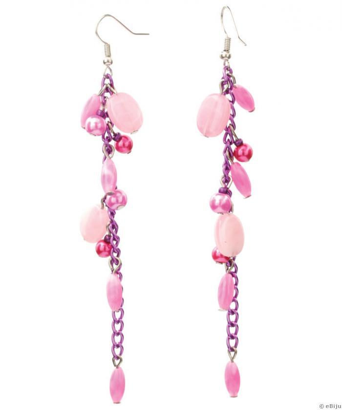 Rózsaszín üveggyöngyökből és szintetikus anyagból készült fülbevaló, lila lánccal, súlya: 7.4 g