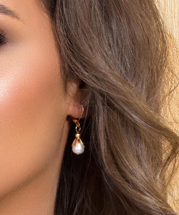 Csepp formájú üveggyöngy fülbevaló, rózsaszín-aranyszínű virág elemmel, leverback kapoccsal.