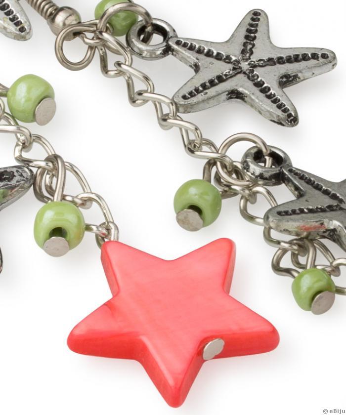 Ezüstszínű fülbevaló piros gyöngyházból készült csillaggal, apró, világoszöld gyöngyökkel. Hossza 7.5 cm