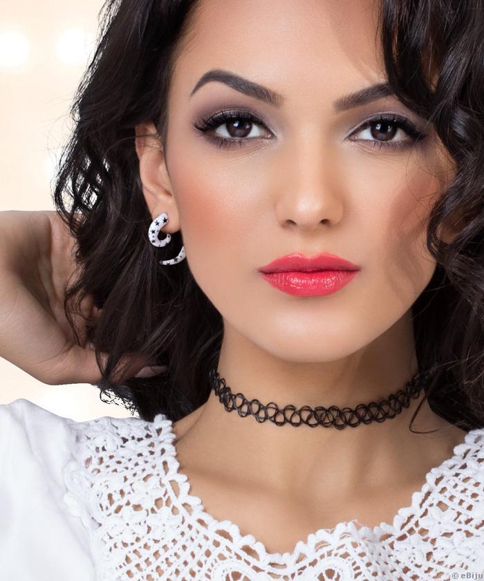 Egy játékos és fiatalos divatékszer, mely a megszokott egyszerű, fekete vagy barna tribál fülbevalók színvilágától elrugaszkodva egy játékosabb mintázatot mutat. Ajánljuk fiatalos hölgyek vagy tinilányok figyelmébe, merész és vagány kiegészítője lehet rockos öltözeteknek.