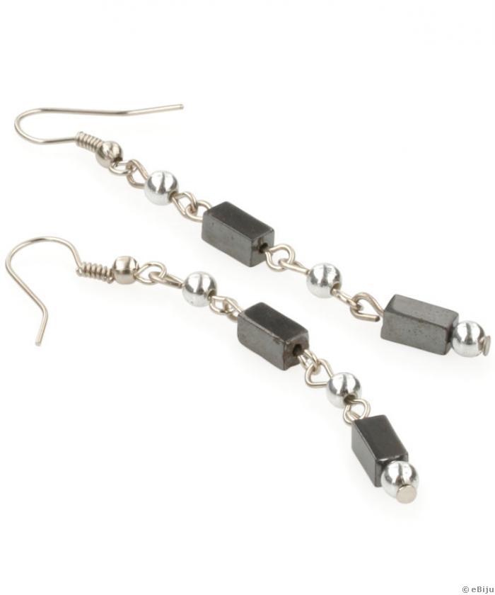 Hematit fülbevaló ezüst színű gyöngyökkel, hematit kövek mérete: 0.4X0.8 cm