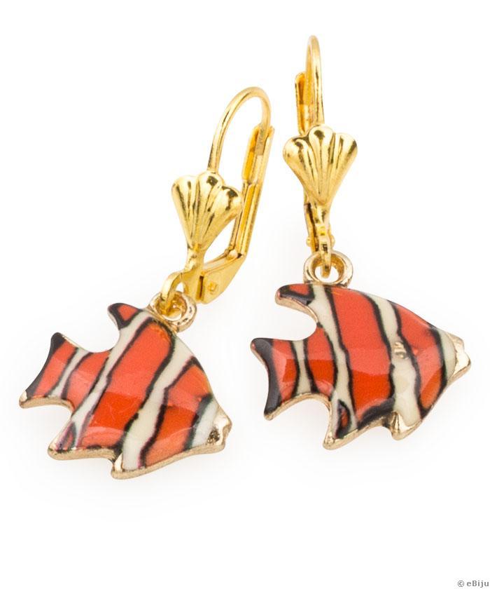 Naracssárga és fehér csíkos halacska fülbevaló, zománcozott fémből, leverback kapoccsal.