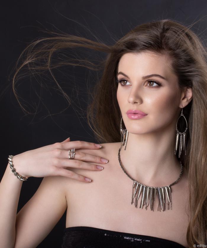 “Rocker Girl” fülbevaló, mely ezüstszínű fém szálra fűzött tüskékből és lánc-rojtokból áll.