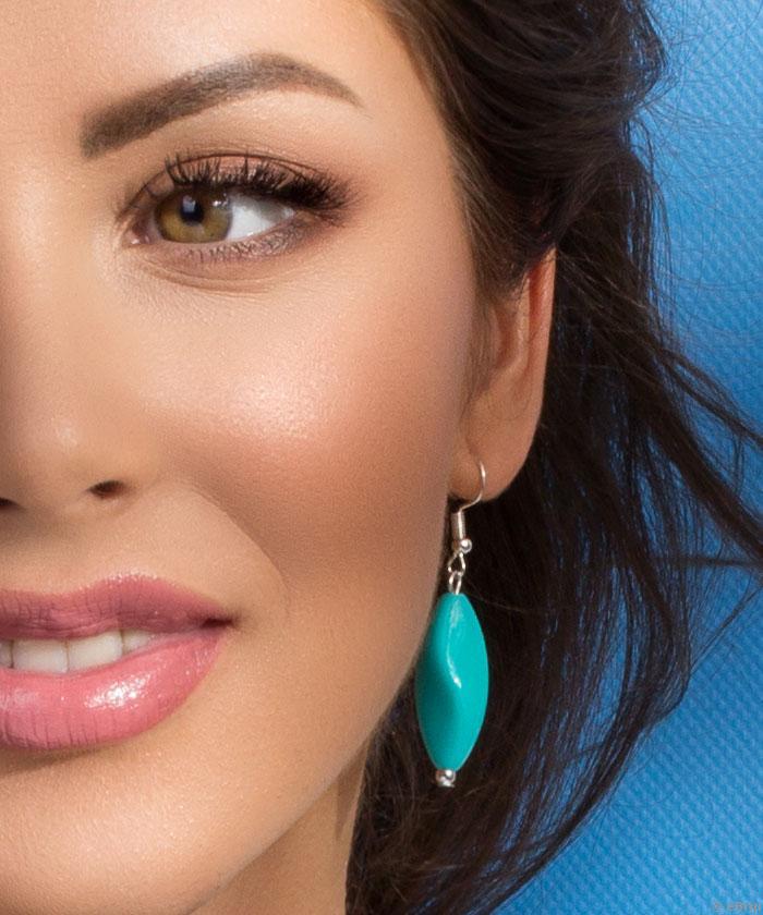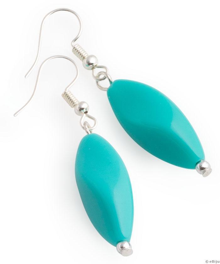 Türkizkék fülbevaló, hosszúkás rombusz formájú akrilból.