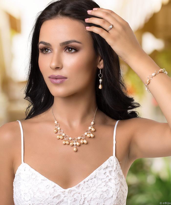 Üveggyöngyös fülbevaló, csepp formájú, sötét- és világos krémszínű gyöngyök ezüstszínű karikával.