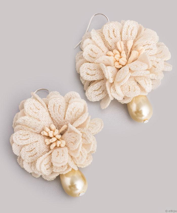 Virág fülbevaló, krémszínű csipke könnycsepp formájú üveggyöngyökkel.
