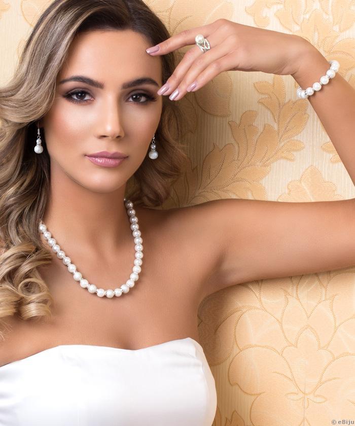 Elegáns gyűrű, kristályokkal díszített, egyszerűsített levél formával, amin egy fehér üveggyöngy henlyezkedik el.