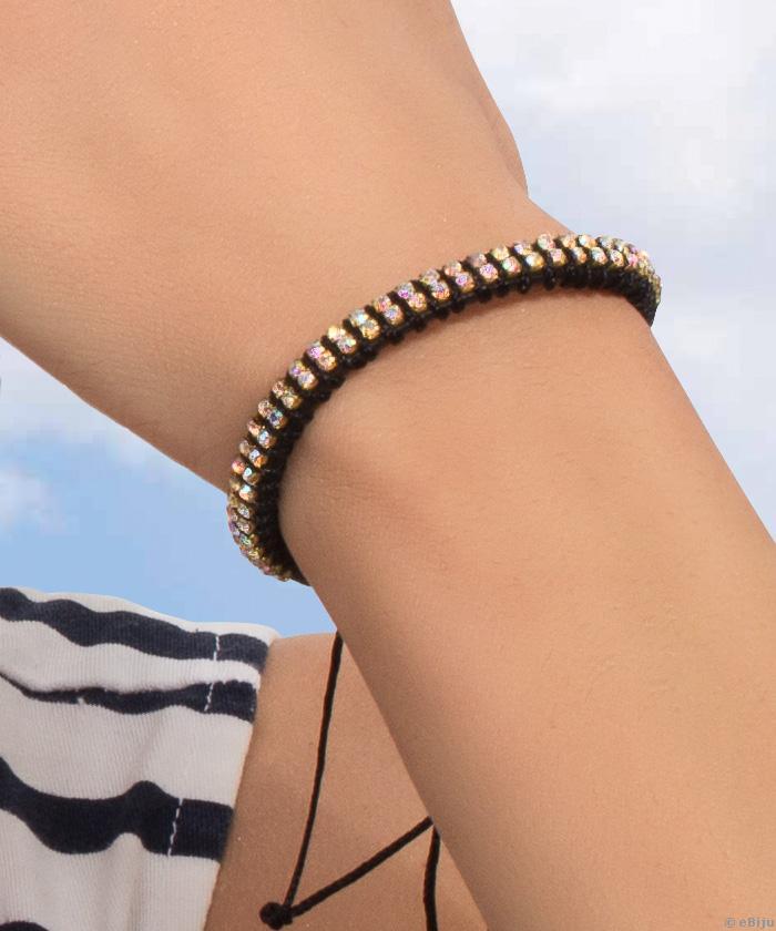 Aurora borealis fényű kristályos karkötő, fekete, csomózott bőrrel.