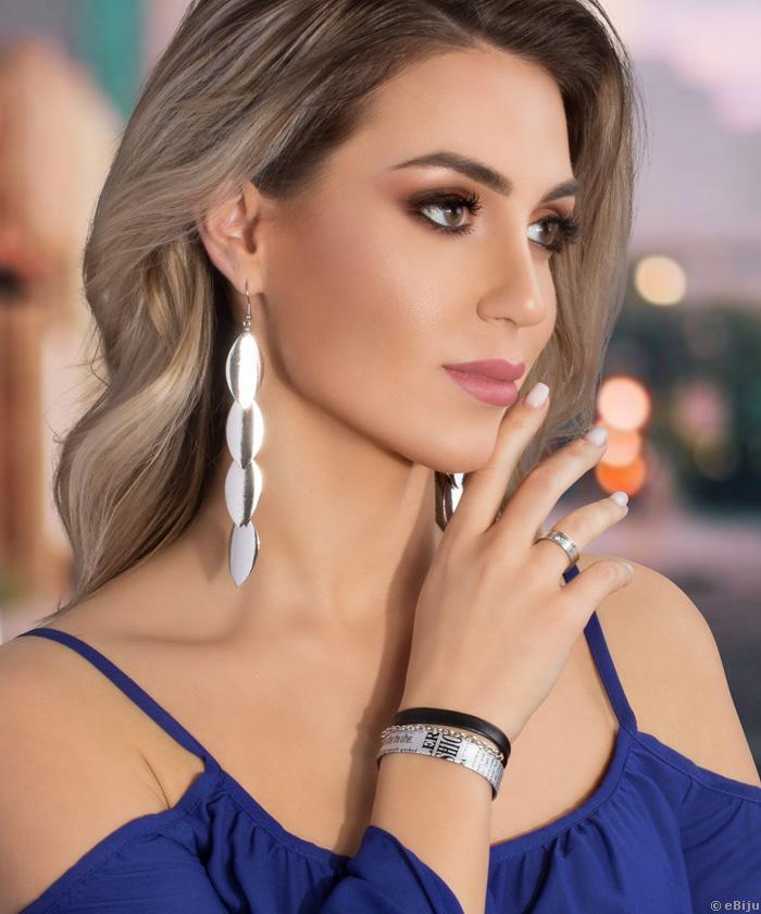 Fekete-ezüstszínű karkötő, újságcikk imprimével, ezüstszínű lánccal a két természetbarát bőr között.
