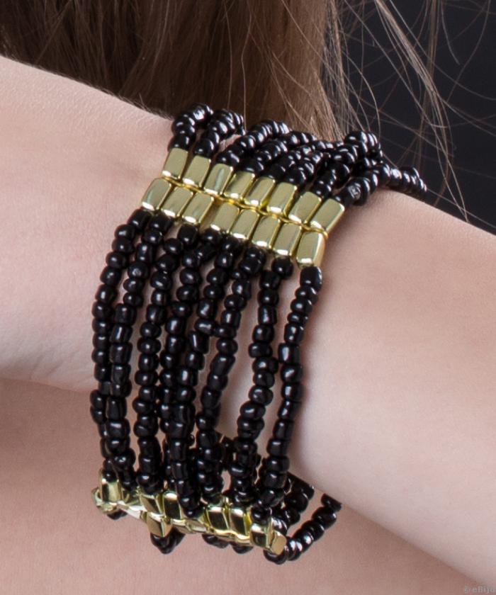 Feket üveggyöngy karkötő aranyszínű fém kiegészítőkkel, elasztikus szálon. A karkötő 8 soros.