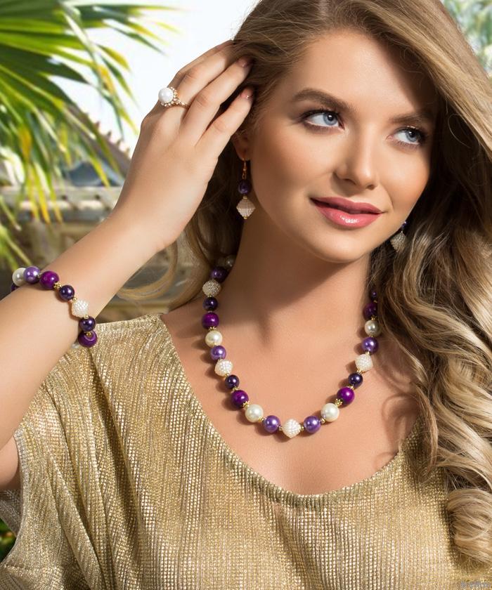 Lila-krém üveg- és fagyöngyös karkötő