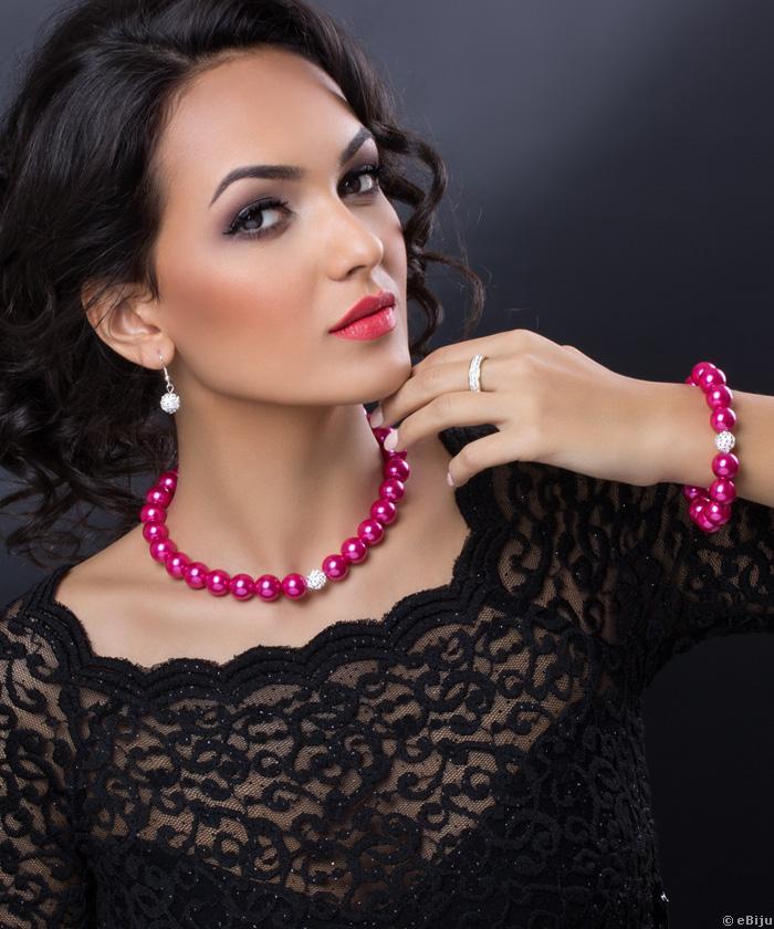 'Pink Shine' karkötő, egy sor rózsaszín üveggyöngyből és egy shamballa típusú fehér sok kristályos gyöngyből készült, elasztikus szálra fűzve. A shamballa gyöngy a karkötő központi részén helyezkedik el.