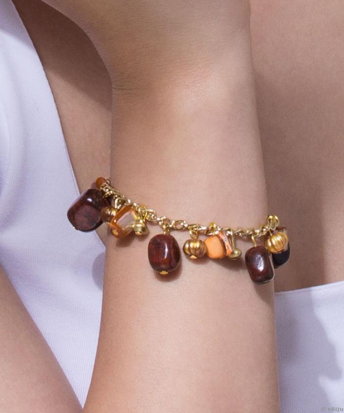 Barna jáspis és narancssárga gyöngyház kövekből készült karkötő, szintetikus anyagú dekoratív elemekkel, aranyszínű alumínium lánccal.