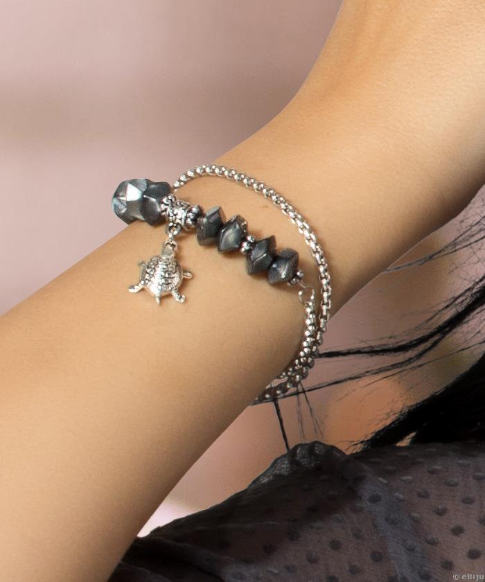 Ezüstszínű teknősbéka karkötő, fazettált, sötétszürke akrillal ezüstszínű lánccal.
