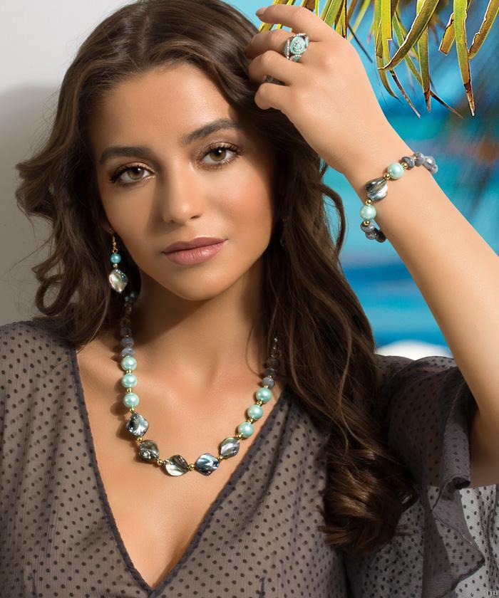 Karkötő, világoskék üveggyöngyök szabálytalan formájú kék gyöngyházzal, szürke és aranyszínű akrillal, elasztikus szállal.