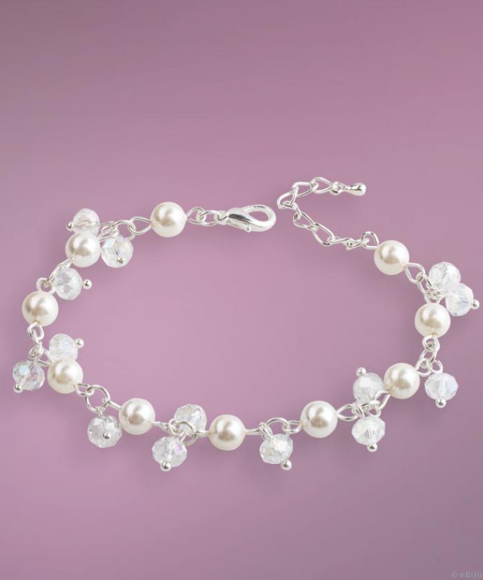 Menyasszonyi karkötő, fehér gyöngyház gyöngyökből és átlátszó fazettált kristályokkal, ezüstszínű fém láncon.