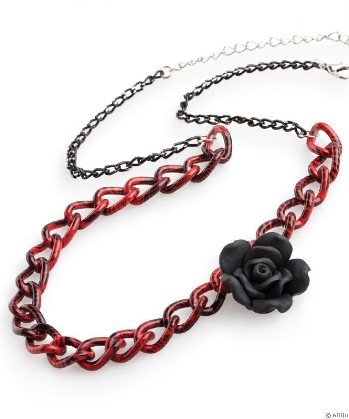 Piros-fekete csíkos láncból, fekete fimó virágból álló nyakék, fekete vékony lánccal. A rózsa asszimetrikusan van elhelyezve, modernebb hangulatot kölcsönözve a nyakéknek.