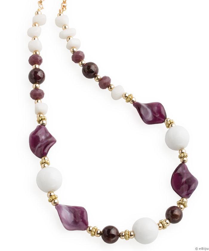 Bordó gránát gyöngyös nyakék, fehér jáspissal, lila-bordó rondelle kristályokkal, bordó és aranyszínű akrillal.