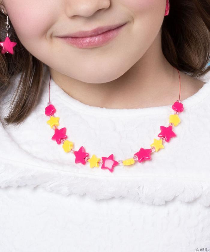 Rózsaszín csillagos és sárga virágos nyakék, kislányoknak, rózsaszín szálon. A csillagok és a virágok ritmikusan váltják egymást, mindegyik elem közé egy átlátszó szintetikus gyöngy van elhelyezve.