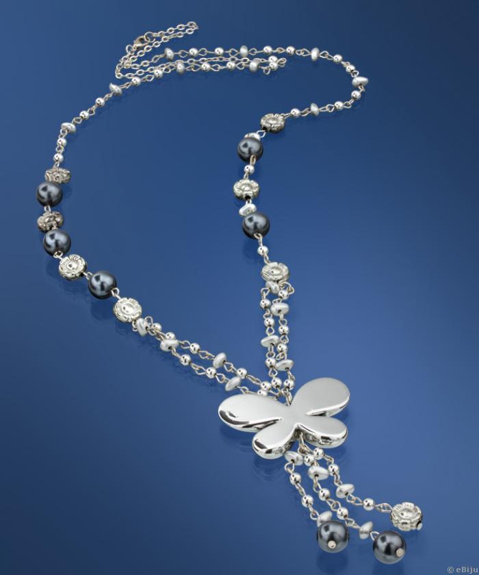 Ezüst színű pillangó nyaklánc, szürke üveggyöngyökkel