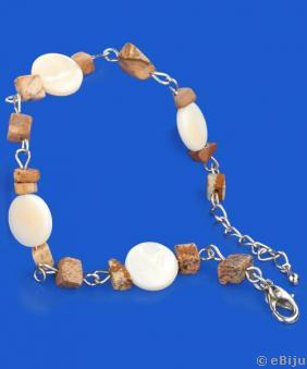 Ezüstszínű szíves nyaklánc fehér, tenyésztett gyöngy formájú üveggyöngyökkel, szív formájú kapoccsal.