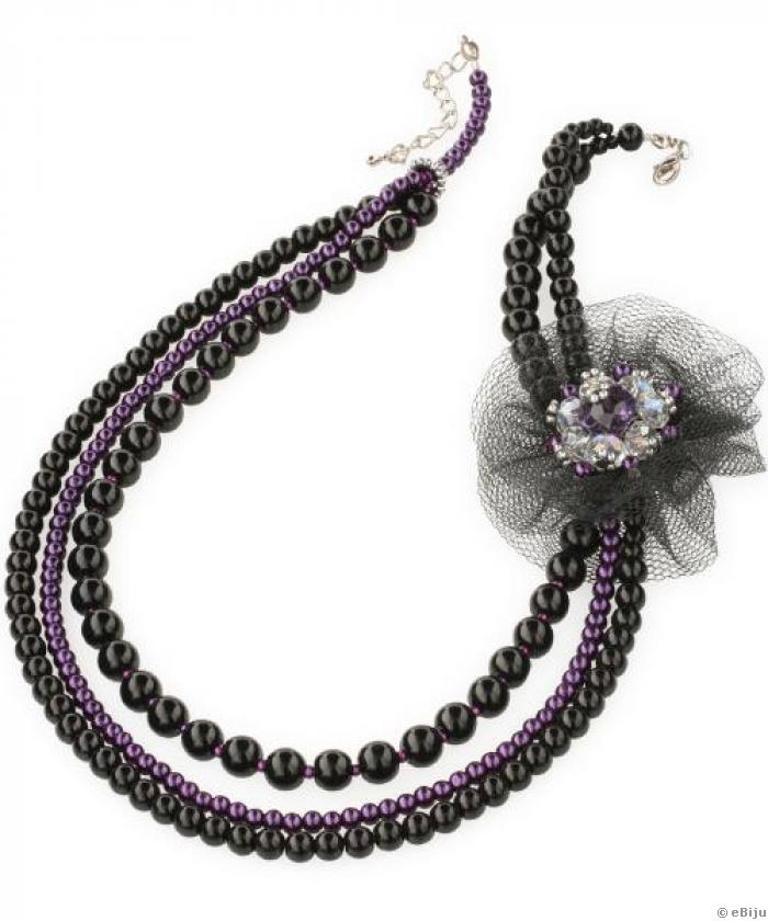 Fekete-lila nyakék, tüll virág fehér és lila kristályokkal üveggyöngy szálakon