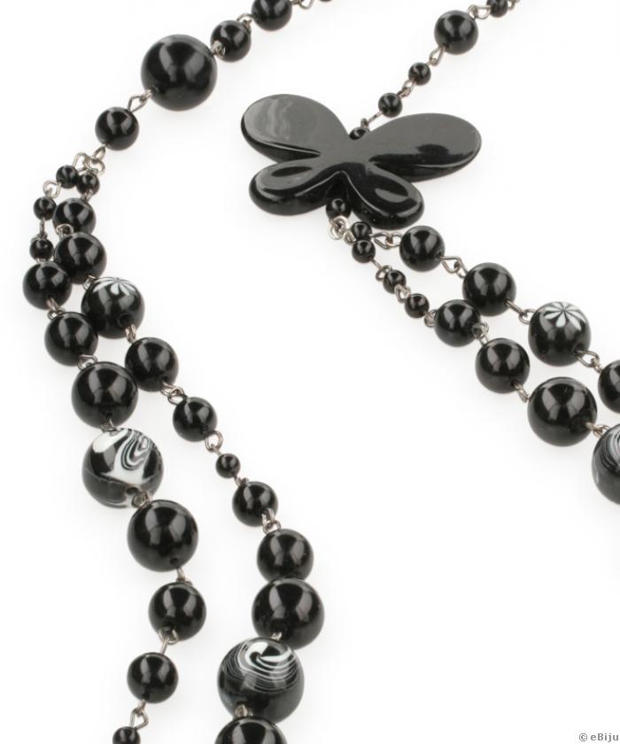 Fekete, mintás üveggyöngy nyaklánc, fekete pillangóval