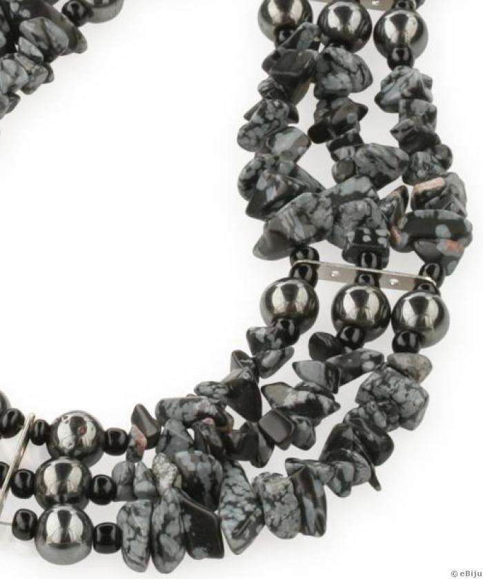 Háromszálas, hópehely mintás obszidián nyaklánc hematit gyöngyökkel