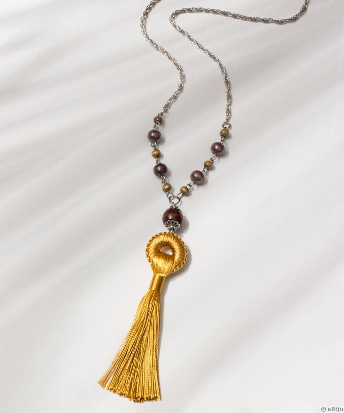 Hosszú nyakék, mustárszínű rojttal és fa gyöngyökkel