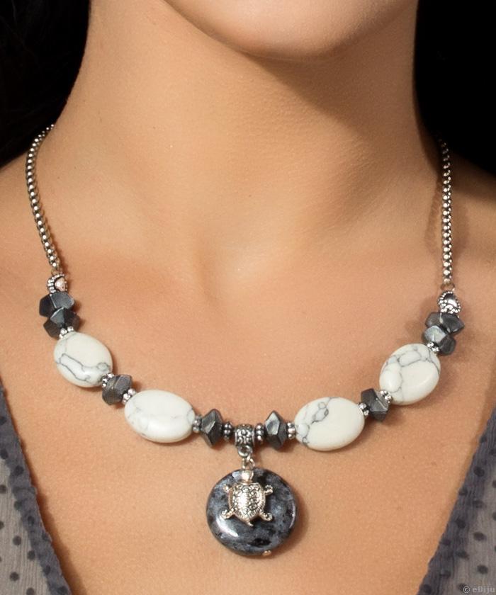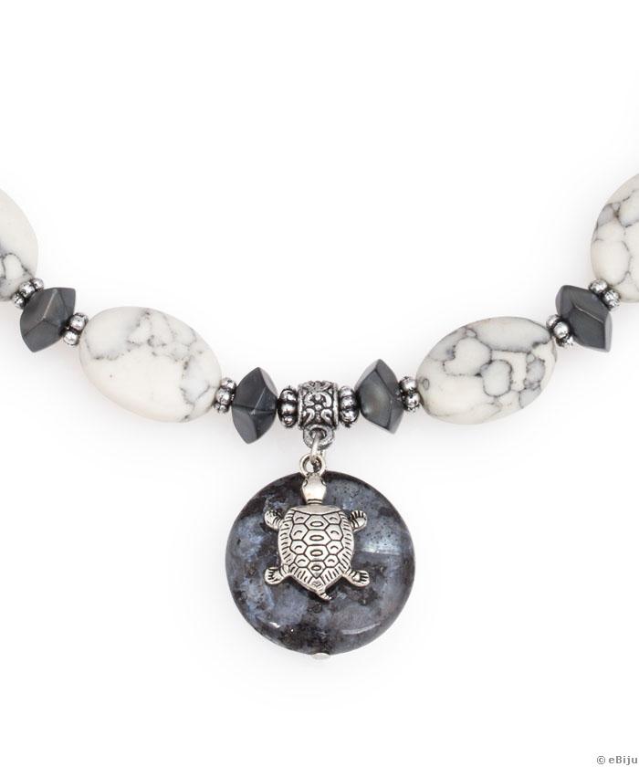 Fehér howlit köves nyakék, larvikite jáspis és ezüstszínű fém teknősbéka medállal, sötétszürke fazettált akrillal, ezüstszínű szívecskékkel és lánccal.