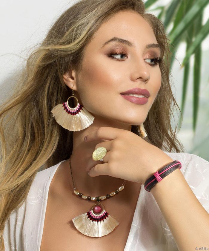 Krémszínű üveggyöngyös nyakék, legyező formájú, fényes textil rojttal.