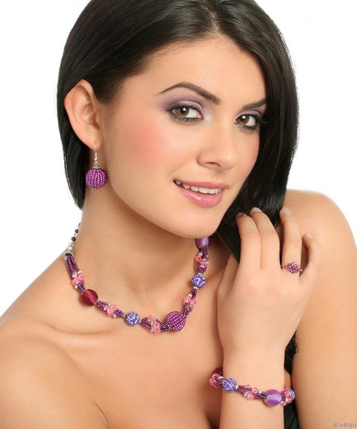 Nyakék lila üveg-, textil-, gyurma gyöngyökből és kristályokból. A nyakék megvásárlásakor ajándékba kapja a rózsaszín szív fülbevalót szintetikus kristályból, átmérője: 1.2 cm (4858).