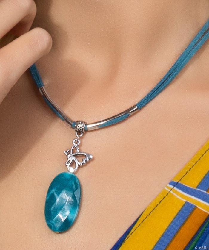 Ovális türkiz medál, márvány mintás akril ezüstszínű pillangóval, hajlított fémmel, türkiz suede szállal.