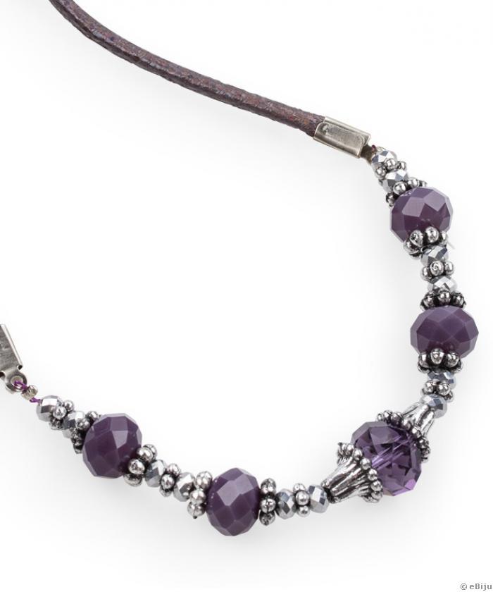 Lila, fazettált kristályos nyakék, ezüstszínű dekoratív elemekkel, csillámos természetbarát bőrön. A középső kristály nagyobb méretű és átlátszó.