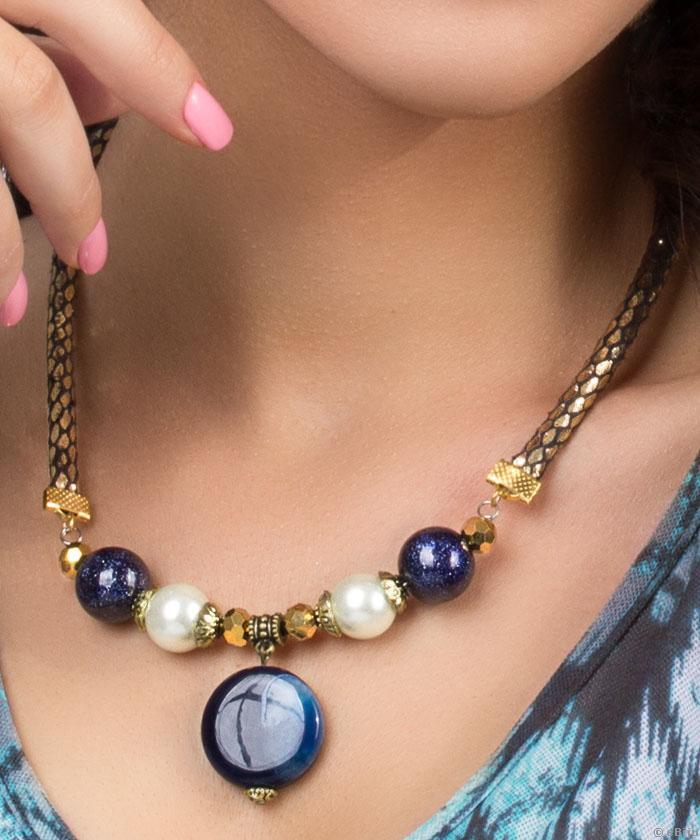 Sötétkék agát medálos nyakék, krémszínű üveggyöngyökkel, napkő imitáció gyöngyökkel, fazettált aranyszínű kristályokkal, aranyszínű animal print mintás természetbarát bőrrel.
