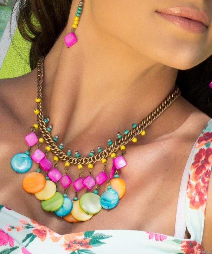 Színes, bohém stílusú nyakék, narancssárga, kék, sárga, zöld és fukszia gyöngyházzal, türkiz és szürke fagyöngyökkel, valamint apró, sárga üveggyöngyökkel, bronzszínű fém láncon.