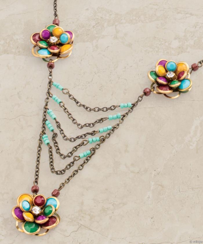 Indie nyakék három színes kristályokkal kirakott virággal, amit vízszintesen elhelyezett láncok gazdagítanak türkiz kásagyöngyökkel. A nyakékhez használt lánc bronzszínű fémből készült, helyenként türkiz és barna kásagyöngyök díszítik.