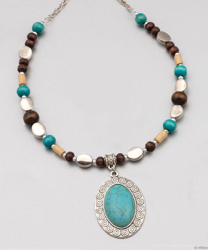 Türkiz howlit medálos nyakék ezüstszínű kerettel, fa gyöngyös (barna, türkiz és natúr színű) és ezüstszínű akril láncon.
