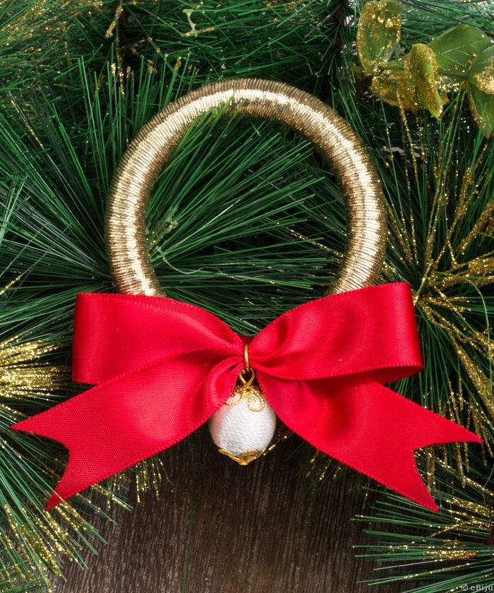 Karácsonyi koszorú karácsonyfadísz, aranyszínű lamé szálas kör forma, piros szatén masnival, fehér textil szállal bevont gyönggyel.