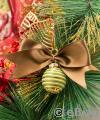 Narancssárga karácsonyfadísz, aranyszínű szállal bevont gyöngy aranyozott szélű bordó szatén masnival.